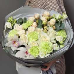 Price: $115.00delicate bouquet with green dianthus and orchids