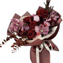 Price: $199.00 Unusual pink-purple roses with the addition of eucalyptus Product Tags: Next-day Delivery
