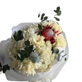Price: $133.00 Delicate, small bouquet of hydrangea, white roses, dianthus and eucalyptus Product Tags: Same-day Delivery