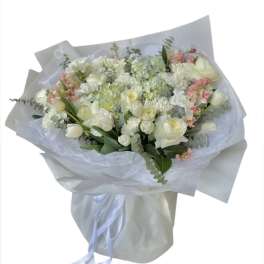 Price: $145.00 luxury composition in white shade with addition of white ranunculus Product Tags: Same-day Delivery