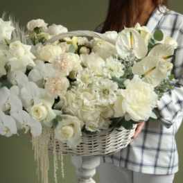 Price: $170.00 white composition with orchids, hydrangeas, dianthus, spray roses Product Tags: Next-day Delivery